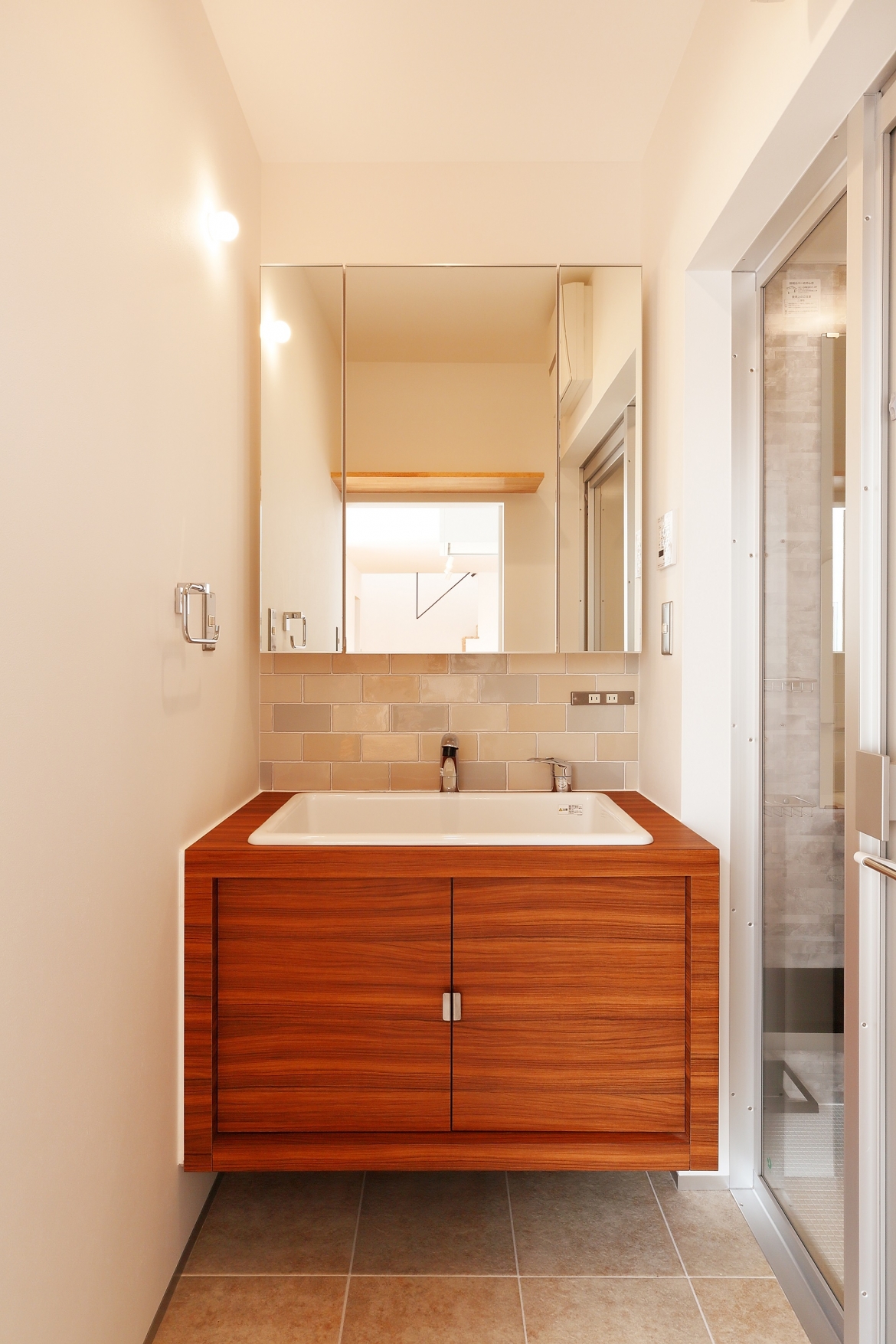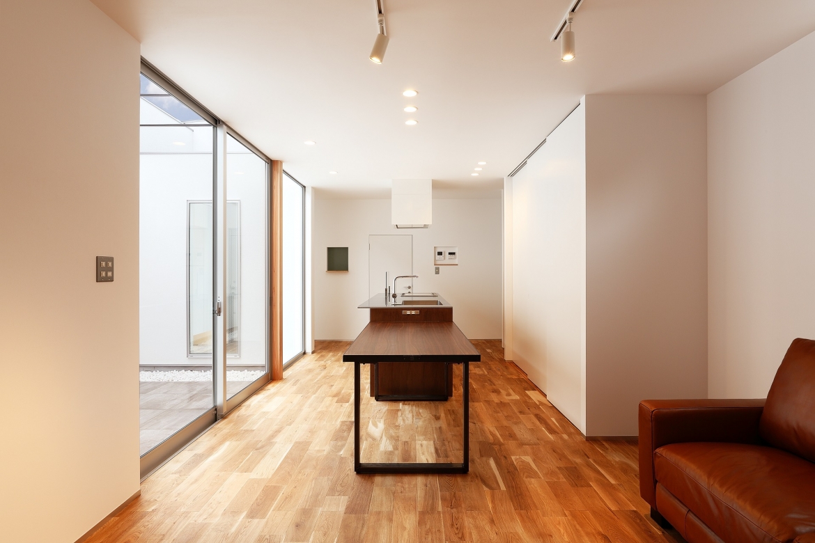 無駄を削ぎ落したシンプルな外観フォルムは、住人の気配を感じさせないくるまれた空間となっている。LDKに面したコートスペースからは、光と風を十分に取り入れ、且つ道路や隣家からのプライバシーを確保している。屋根と外壁をガルバリウム鋼板一体化させることでスマートな立体感を演出した。