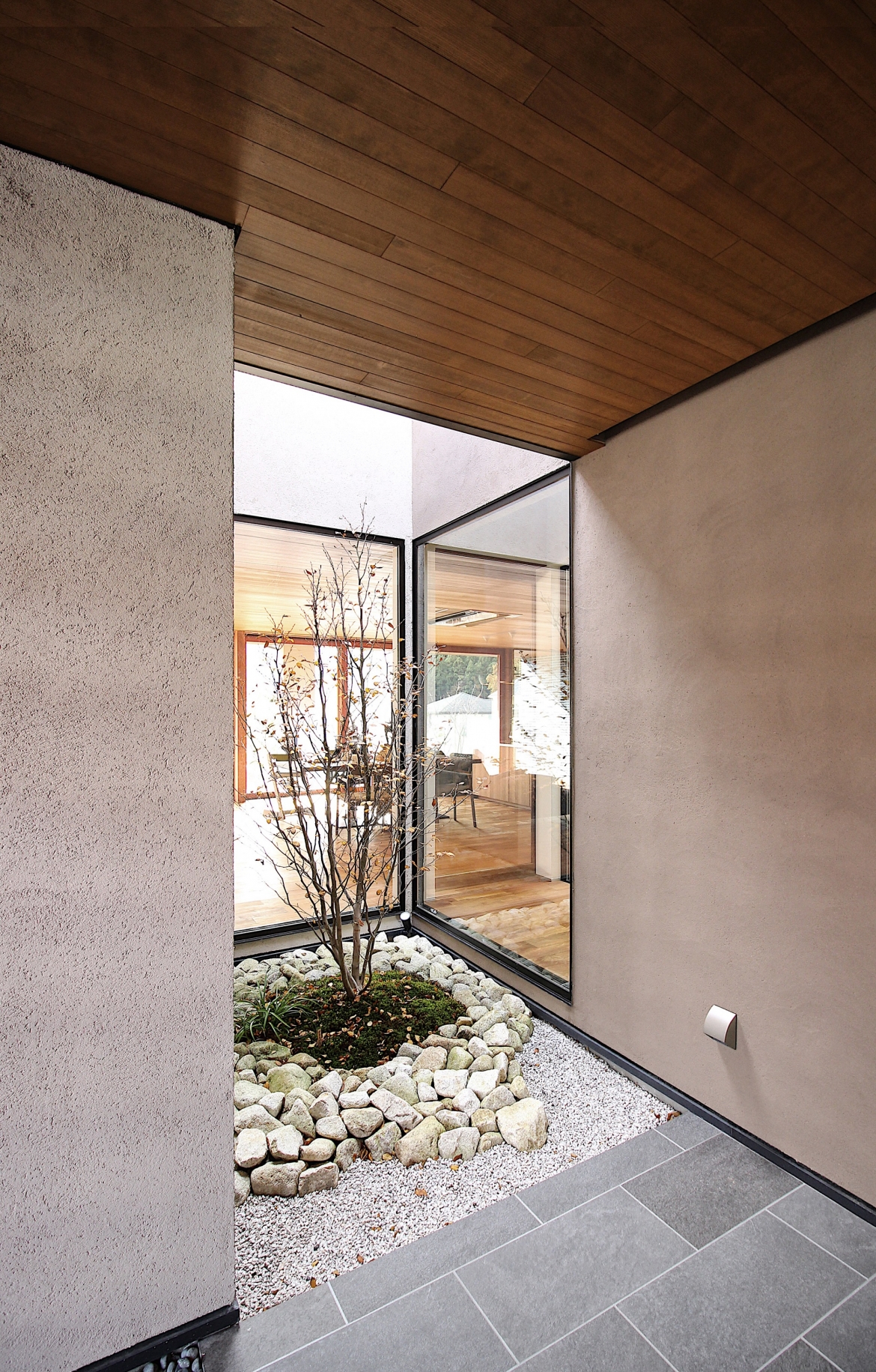 自然に囲まれた環境を生かし、大開口から居住空間に景観を取り込む設計手法。天然木を中心としたプレミアムなスタイリングを施した空間に引き込まれる自然の彩りは、落ち着きのある雅やかな趣を演出する。