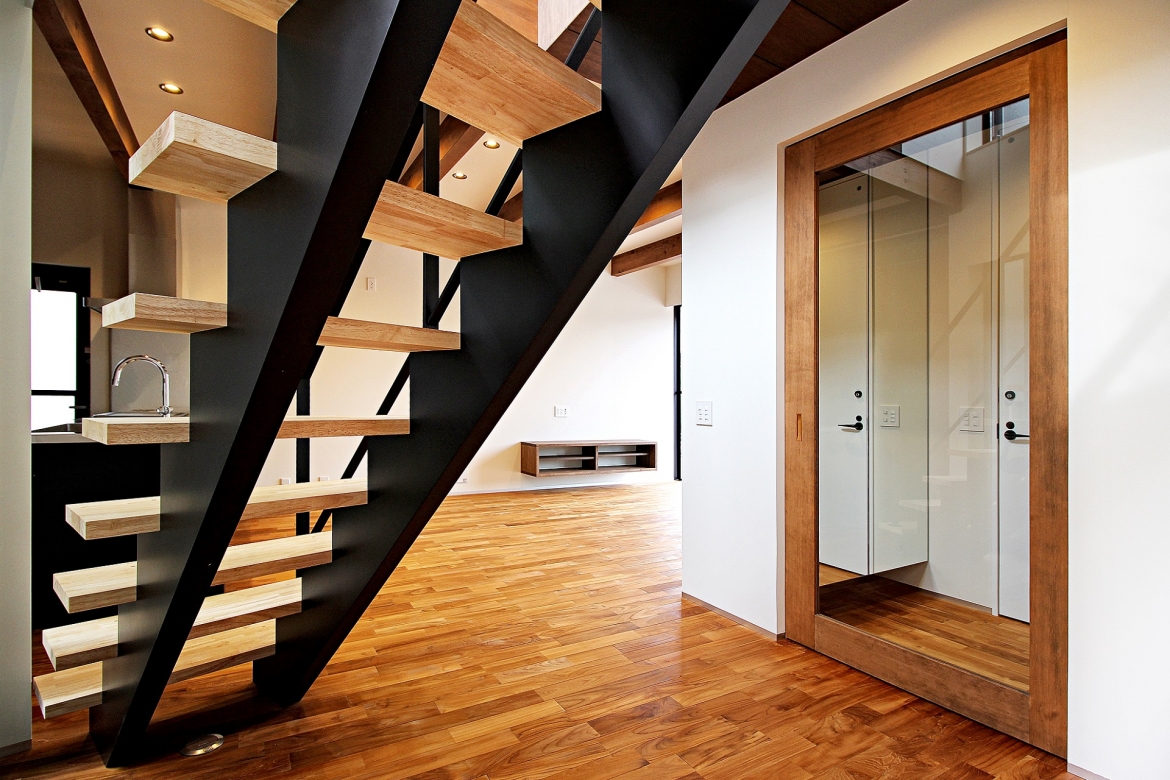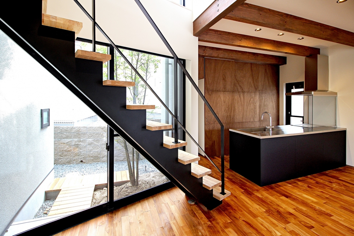 立地条件を生かし採光と風通しを絶妙にコントロールした。階段と中庭部分を斜めに配置することで隣地からの直接的な視線にも配慮した。木質感にブラック色を適度に配色することで優しさとクールさを演出している。