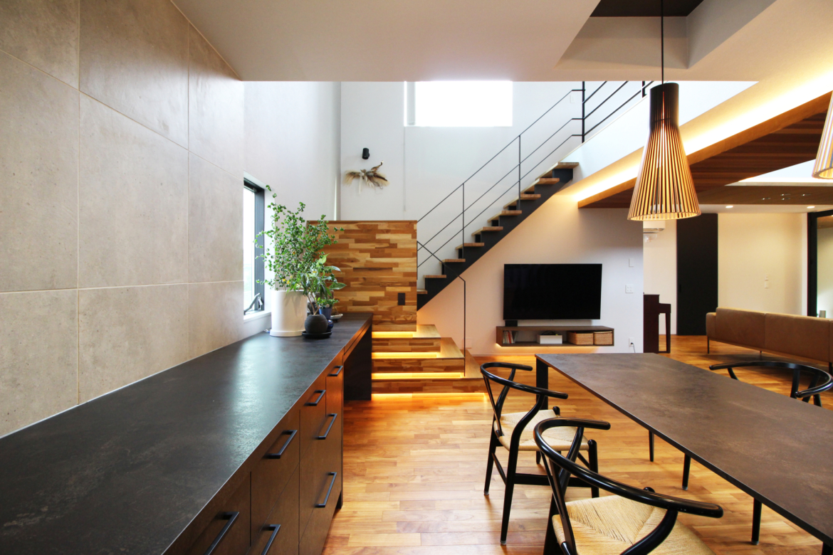 吹き抜け空間の存在感を際立てた照明デザインは昼夜二つの顔を併せ持つ。