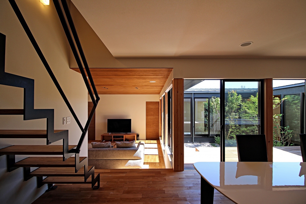 外観のシンプルなイメージからは想像出来ない優雅な中庭を構えた邸宅。エントランスから分岐される居住空間とゲストルームは『隠れ家』的な世界観を演出している。趣味のサロンを別室に構えながらもプライベートなライフスタイルを確立した。全館に流れる音響と光の陰影でゲストの五感を高揚させる。