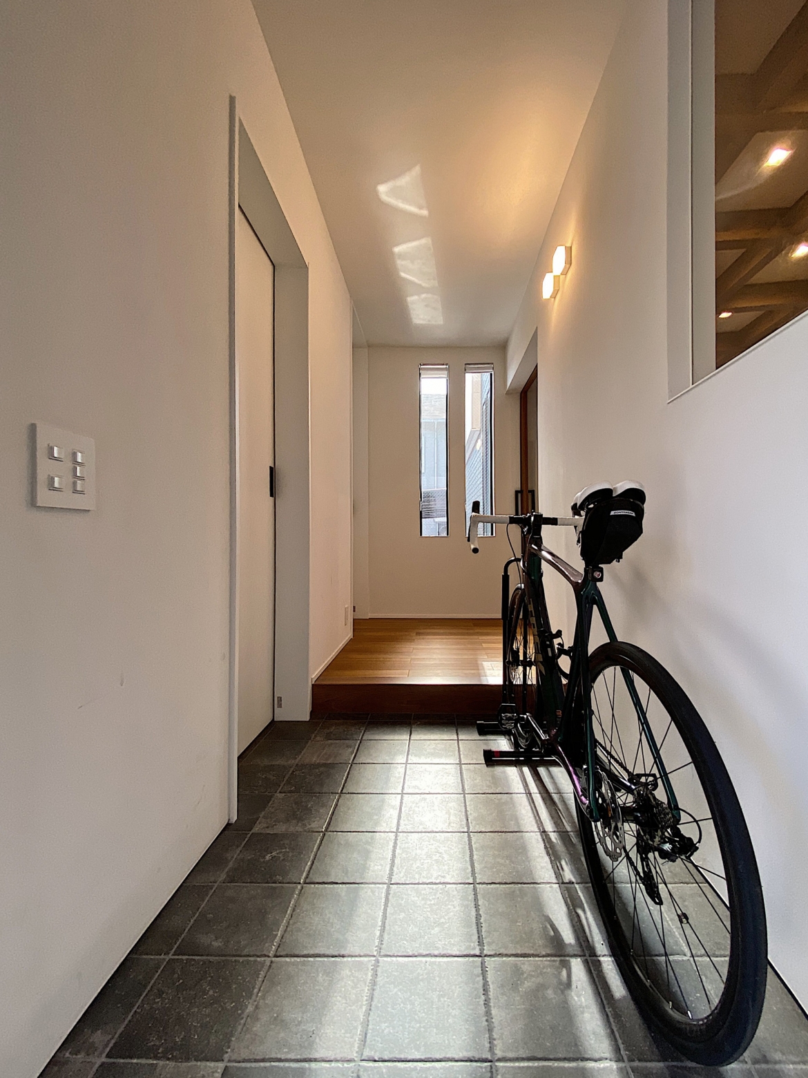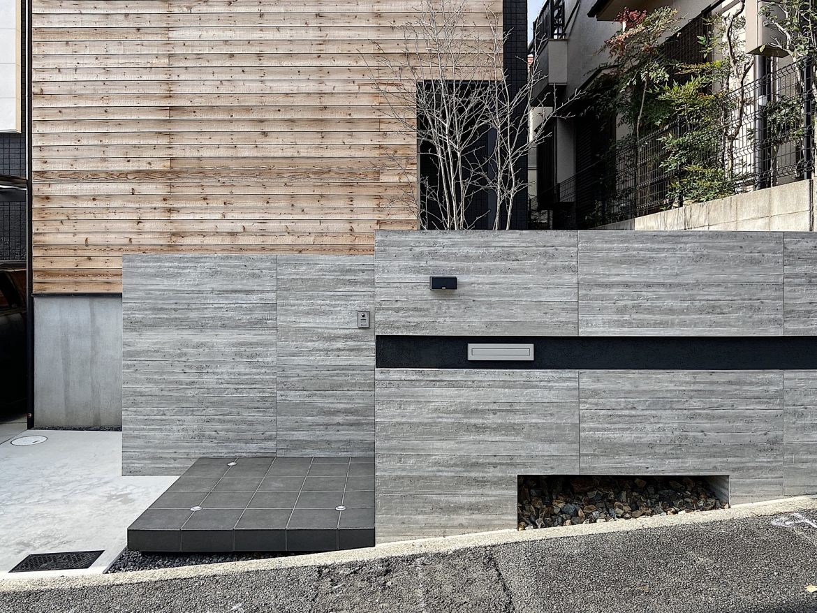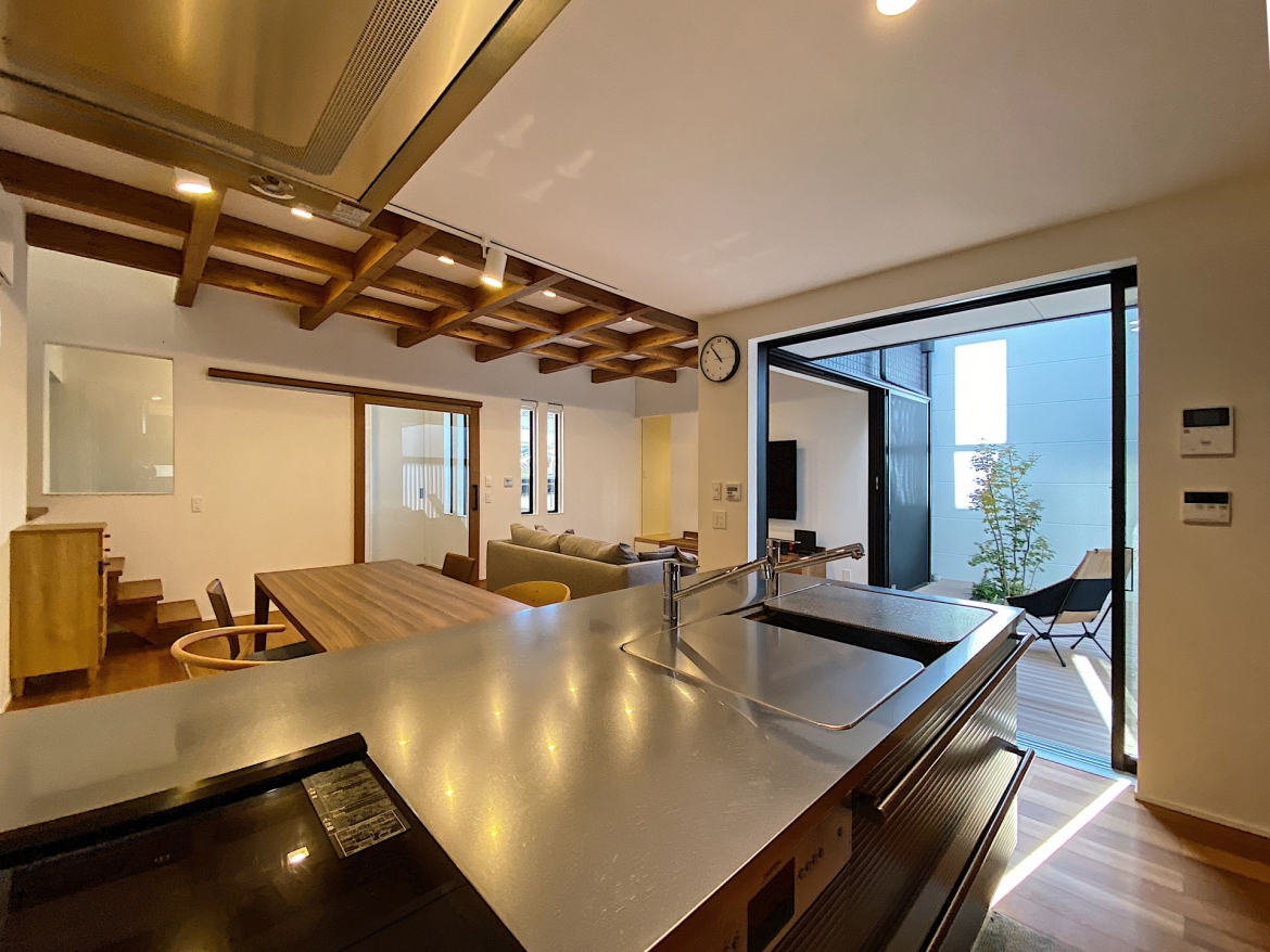 3つの四角いボリュームで構成された外観デザインは素材を使い分ける事で立体感を際立たせている。梁組の格天井で躍動感を持たせた室内から繋がるアウトドアリビングの吹き抜けは、住宅に囲まれた立地においても圧倒的な解放感を与え、降り注ぐ光は暮らしを煌びやかに演出する。
