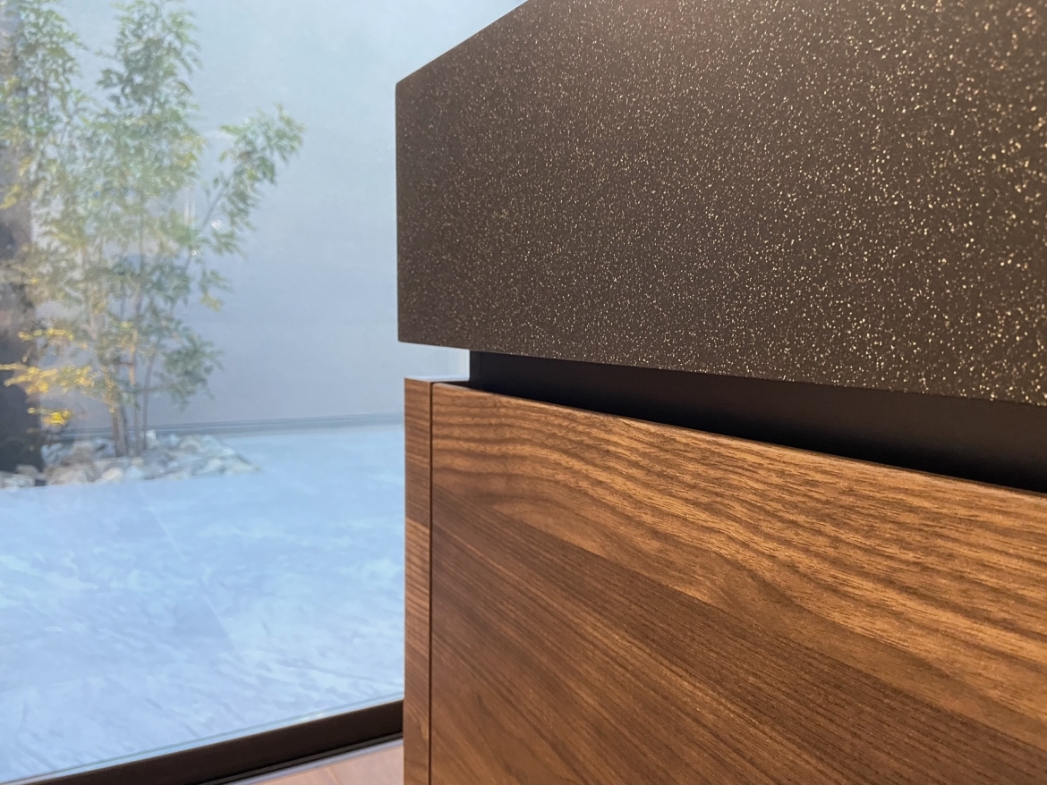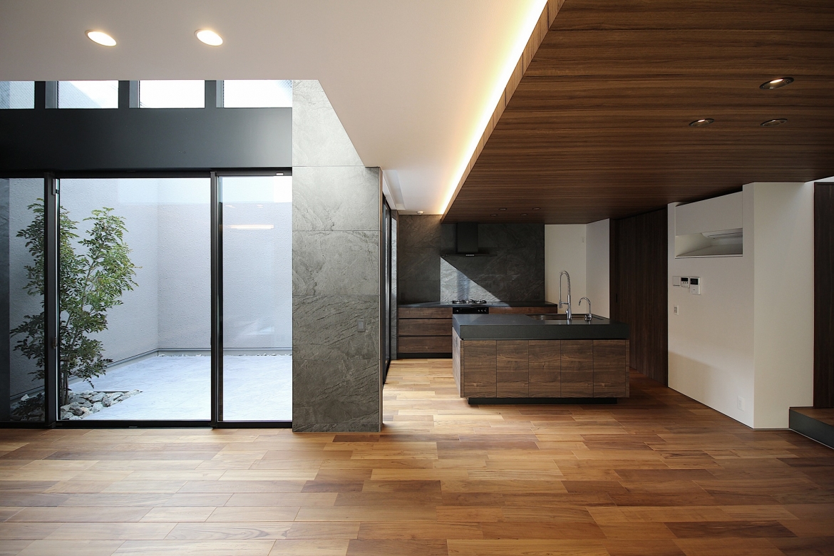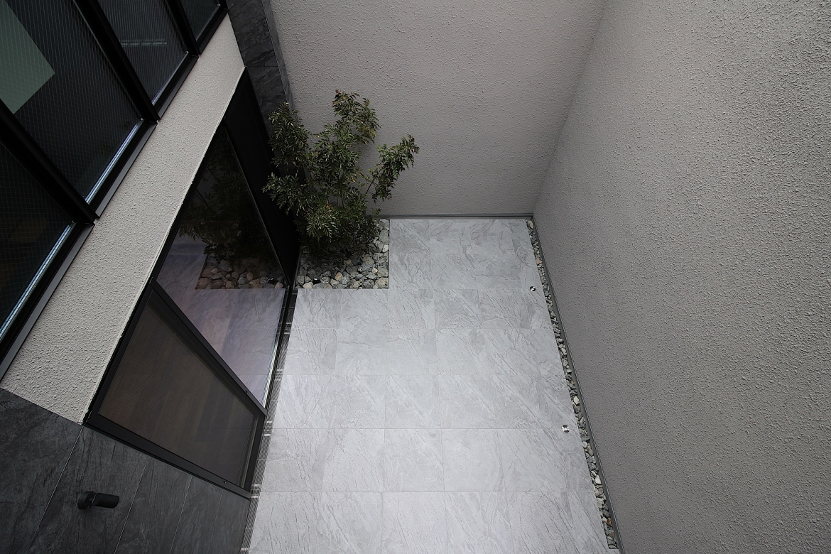 インナーガレージを備えた剛質且つセクシーな外観。ゲート・エントランス・LDK・中庭がガラスを通じて繋がる設計手法で外部と内部の境界線を無くし、柔らかな自然光を室内に誘導する。プライバシーを確保した閉鎖的な印象とは対象的に、伸びやかで優しさのあるインサイドなライフスタイルが時を刻む。