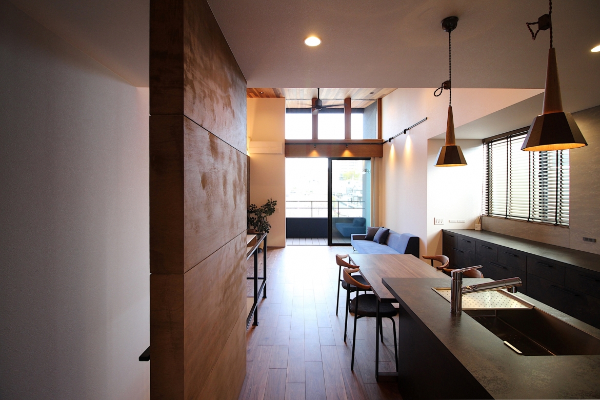 生活の中で生まれる多くの備品を、ストック可能な収納力を中心に、人の動きを緻密に計算した住み易さとデザイン性をフレキシブルに両立させた。敷地条件を一切感じさせない、光と風が降り注ぐ設計で開放感を演出する。