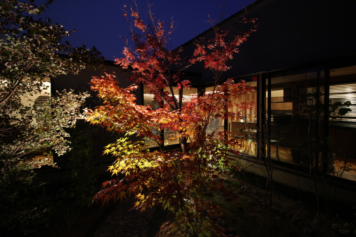 平屋建て中庭付きという特性を最大限に生かし、玄関・廊下・リビング・ダイニング・キッチン・洗面・寝室の7つのエリアから中庭を室内に誘導する設計デザイン。 1フラットで繋がる全室内空間と中庭が、スローで伸びやかなライフスタイルを実現する。 高層階を感じさせる大開放且つクールな窓辺、咲き誇る木々の樹形は、Hawaiiのコンドミニアムを彷彿させる世界へと住人を誘う。