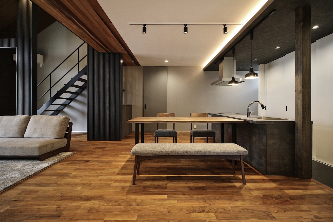 切妻屋根の左右を非対称にし奥行き感を実現した威厳ある外観デザイン。屋根形状を生かした勾配天井の開放的な吹抜けを備えたLDKは凛々しく清々しい空気を住人に送り込む。繊細且つ厳選されたインテリアテクスチャーが織りなす住空間で五感という世界を覚醒させる。