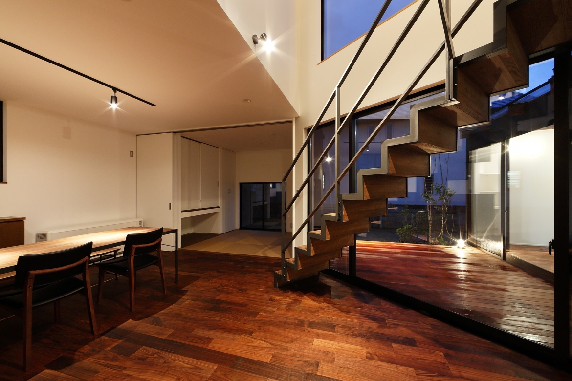 建物と外構の境界線をなくすというコンセプトでデザイン。外構で構成される門・塀と建物本体を一体化させることで豊かな第3の居住空間生み出し、大胆不敵な外観を演出した。サンルーム・ランドリースペース・ファミリークローゼットを一体化し、理想的な家事動線と美しいデザインを両立させた理想スタイル。
