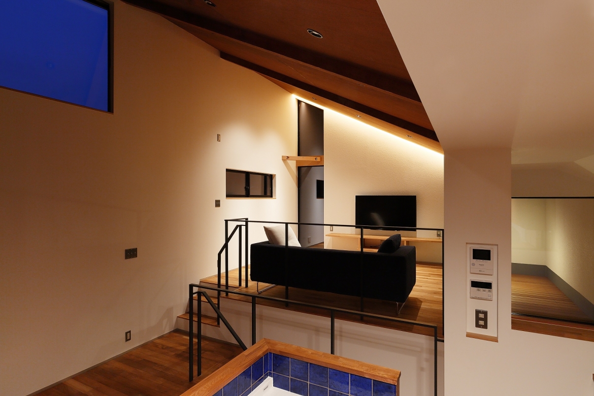 大胆かつシャープな斜メ天井の大空間に、スキップフロアを融合させることで動きのあるLDKを演出した。研ぎ澄まされたシンプルな空間に、エレガントさも兼ね備えた独創的なデザインに人は感嘆する。