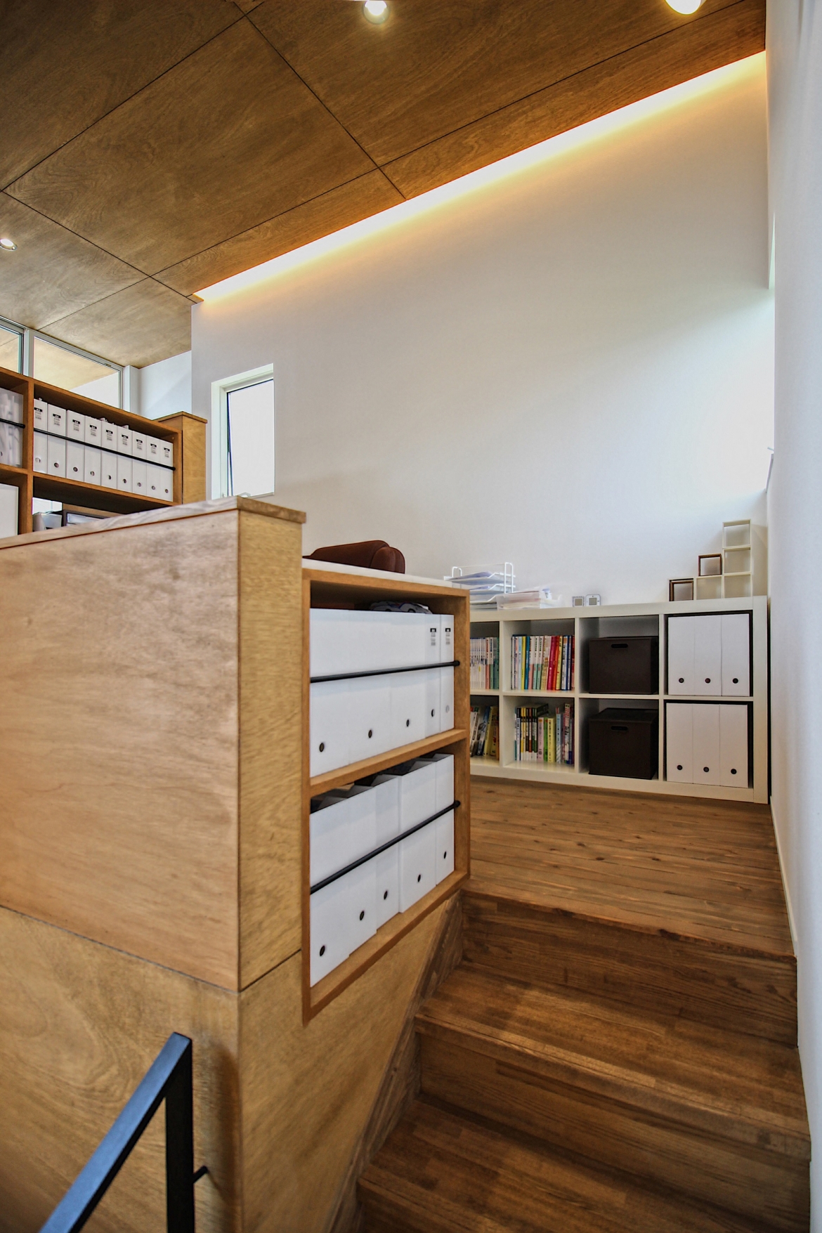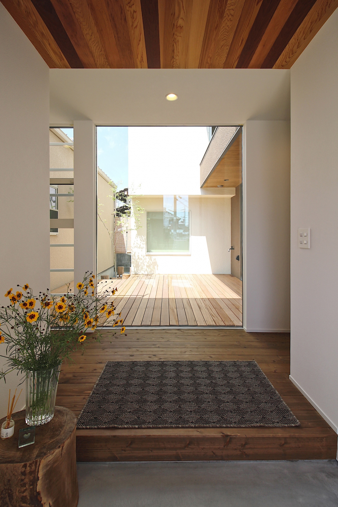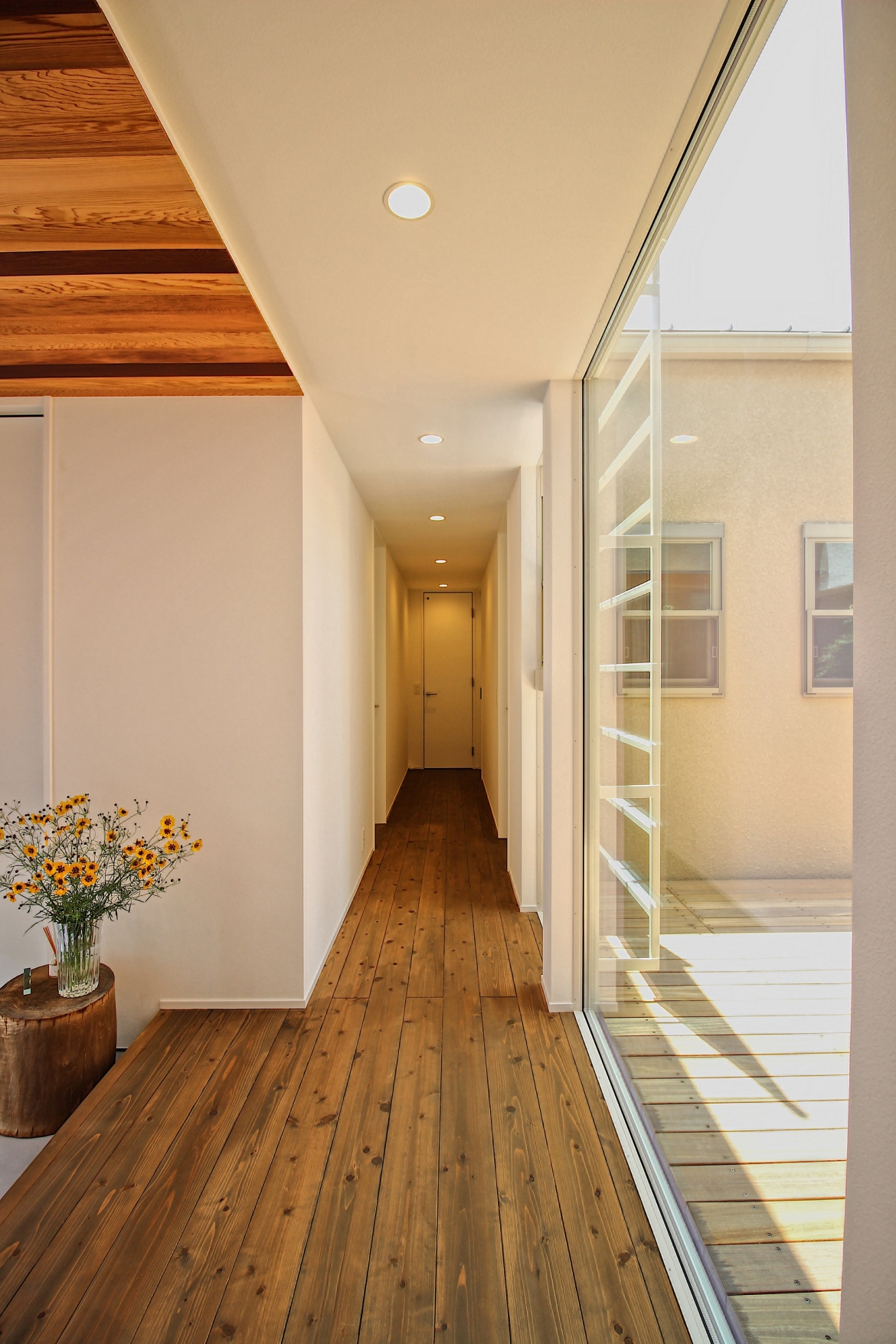 三つの骨格で構成された外観デザイン。建物高さをコントロールすることで迫力あるワイド感を演出した。平屋というフルフラットの特権をあえて捨てスキップフロアを導入することにより 歳を重ねていくであろう住人の美と健康に想いを込めた。中庭デッキから差し込む柔らかな日差しと陰影、そして自然素材の優しさが五感を刺激する。